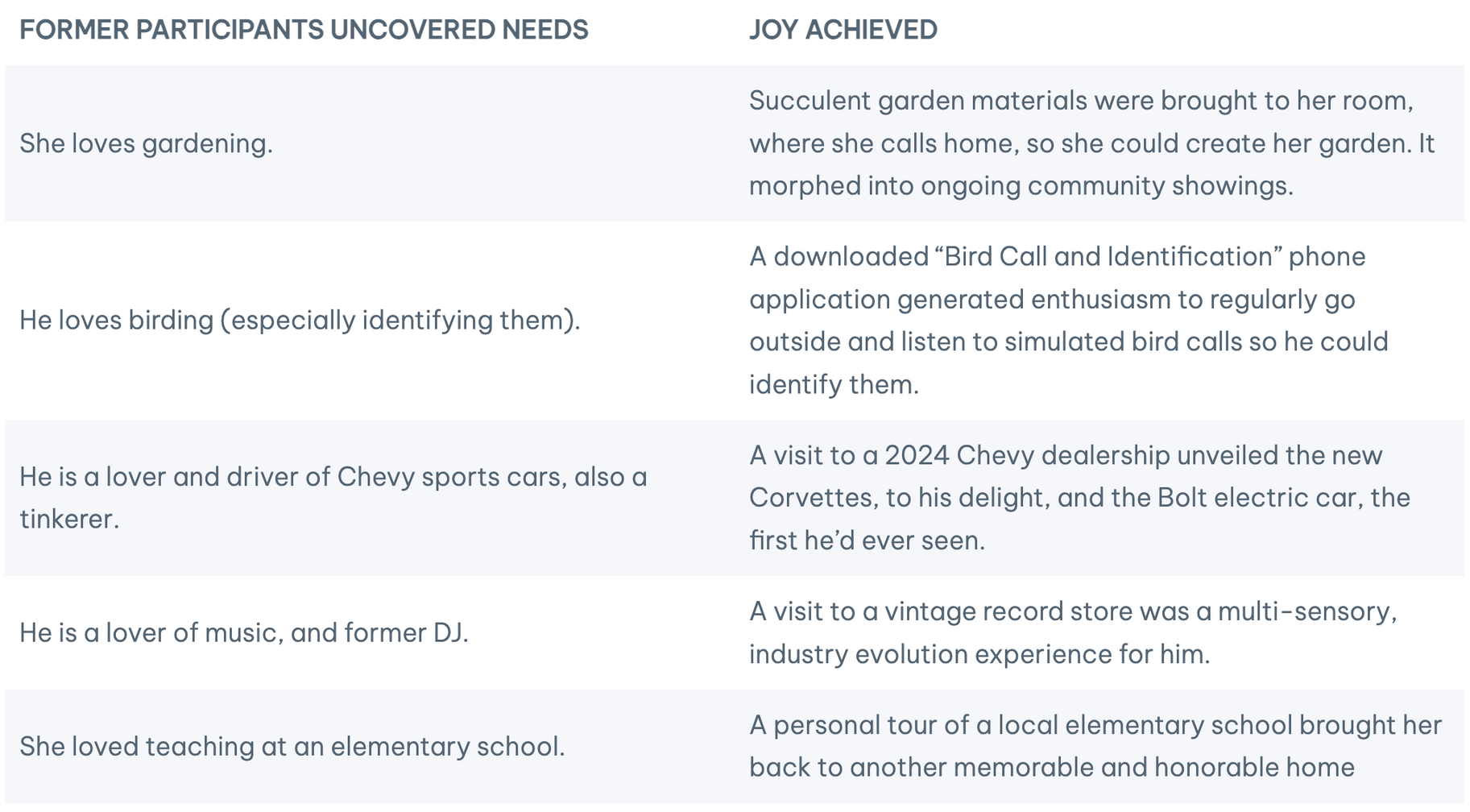 Through a deep social history exploration, the Specialist interviews the participant, and other care partners if important, to help illuminate the interests and activities that have brought joy to them throughout a lifetime. The Specialist then creatively devises an Engagement Plan where the activities and life-joys beautifully align, and the engagement experiences come to life with intention.
